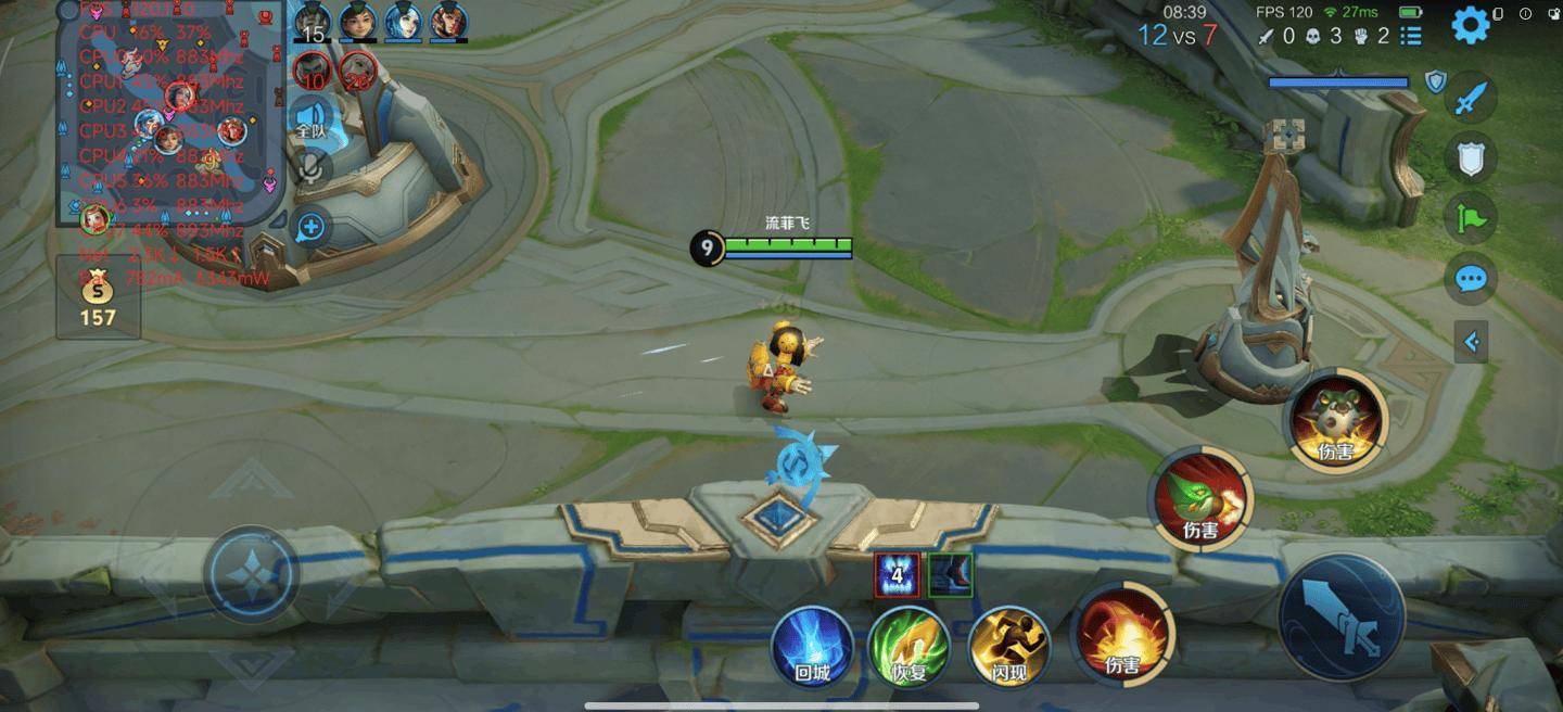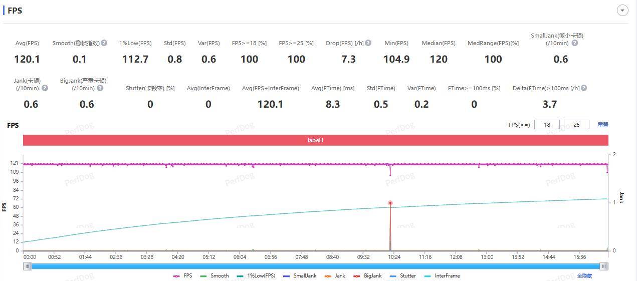 首先是《王者荣耀》,测试时画质选项都拉到最高,然后进行 15 分钟左右的一局人机对战,对于小米 17 Pro Max 来说是轻松应对没有压力,游玩过程中没有卡顿掉帧的感觉,十分流畅,测得平均帧率 120.1 FPS,帧率曲线几乎就是一条直线。