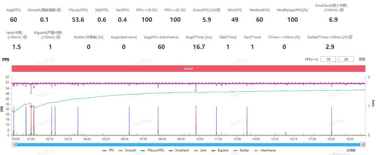 测试结束,测得游戏运行的平均帧率为 60 FPS,1% Low 帧为 53.6 FPS,整体也是非常丝滑流畅的,帧率曲线也基本是直的,过程中没有掉帧卡顿的感觉。