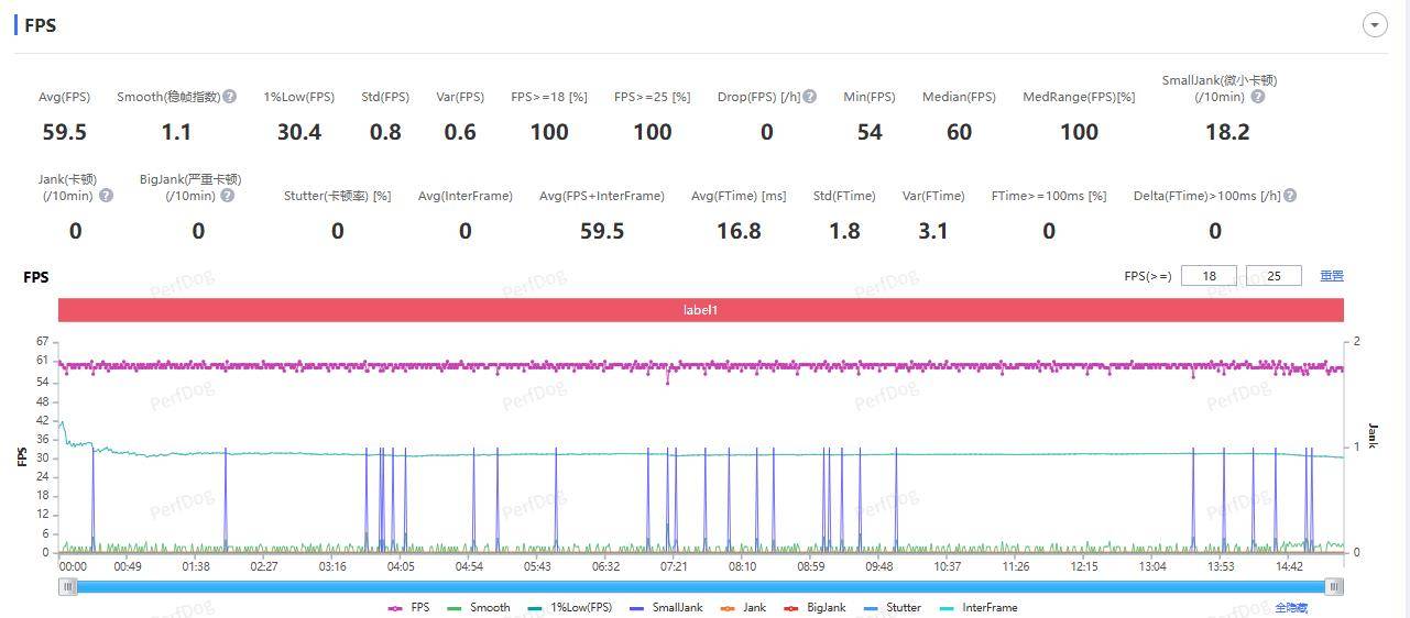 跑图 10 分钟后,测得游戏运行平均帧率为 60 FPS,整个过程也没有遇到卡顿掉帧的情况,帧率曲线上几乎没什么波动。