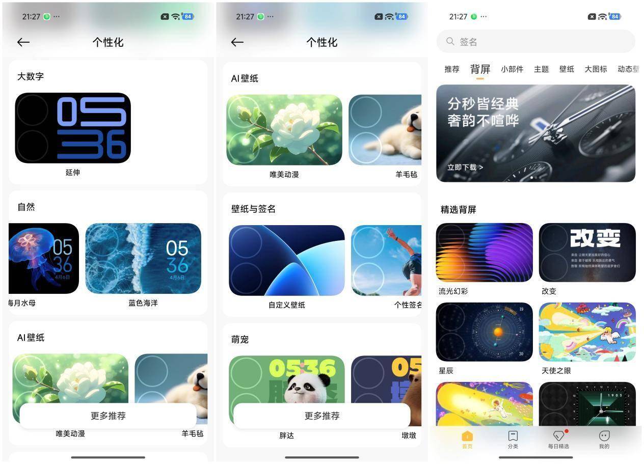 比如它支持个性壁纸,系统内提供了丰富的壁纸选项,有自然风格的,比如蝴蝶或者锦鲤,还有艺术类型的,比如涡核机械的抽象几何、运动记步的健康可视化、时间光谱、深渊镜、猫抓板等等,众多个性壁纸可以带来不同的科幻感、神秘感、治愈感。