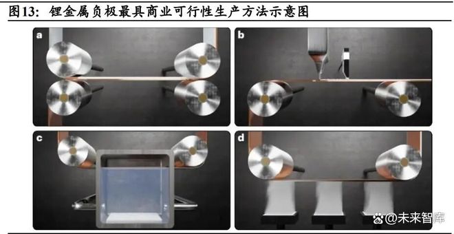 压延法为目前主流工艺。压延法是目前较为成熟的锂负极制造工艺,该工艺 通过挤出和压延的方式将锂带加工成薄片,目前市场主流锂带的厚度普遍超 过 20 微米。尽管 20 微米的锂带在短期内仍将是主流,但从长远来看,固态 电池理想的锂带厚度应为 5-6 微米,以优化能量密度和降低成本。因此,压延法仍有很大的工艺迭代空间。