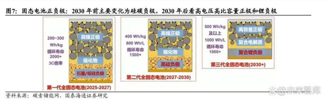 短期看高镍三元,未来看高电压高比容量正极。根据欧阳明高教授:2030 年 前主要变负极和电解质,2030 年后正极改变。固态电池分为三个发展阶段: 1) 石墨/硅负极硫化物全固态电池(2025-2027):以 200-300Wh/kg 为目标, 攻克硫化物固态电解质,打通全固态电池的技术链,三元正极和石墨/ 低硅负极基本不变,向长寿命大倍率方向发展。 2) 高硅负极硫化物全固态电池(2027-2030):以 400Wh/kg 和 800Wh/L 为 目标,重点攻关高容量硅碳负极,三元正极和硫化物固态电解质仍为主 流材料体系,面向下一代乘用车电池。 3) 锂负极硫化物全固态电池(2030+):以 500Wh/kg 和 1000Wh/L 为目标, 重点攻关锂负极,逐步向复合电解质(主体电解质+补充电解质)、高电 压高比容量正极发展(高镍、富锂、硫等)。